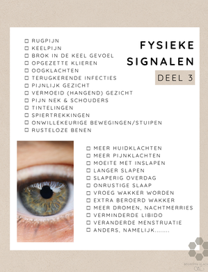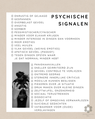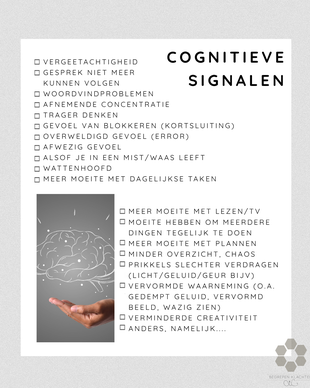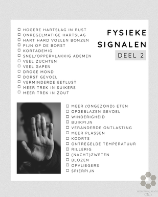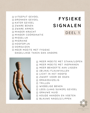 Er zijn tal van fysieke en mentale signalen waar je op kunt letten. In onze pacing begeleiding stelden we eerst een open vraag: welke signalen krijg jij als je te ver gaat? Wat zijn signalen dat je echt al ver in het rood zit? Voor veel mensen is het nog best moeilijk om die concrete signalen te noemen. Daarom hebben we een lijst gemaakt, gebaseerd op literatuur en ervaringen van patienten met fysieke en/of cognitieve uitputting. Het zijn signalen die we kennen bij uitputting, bij overbelasting, bij fysieke of emotionele stress.