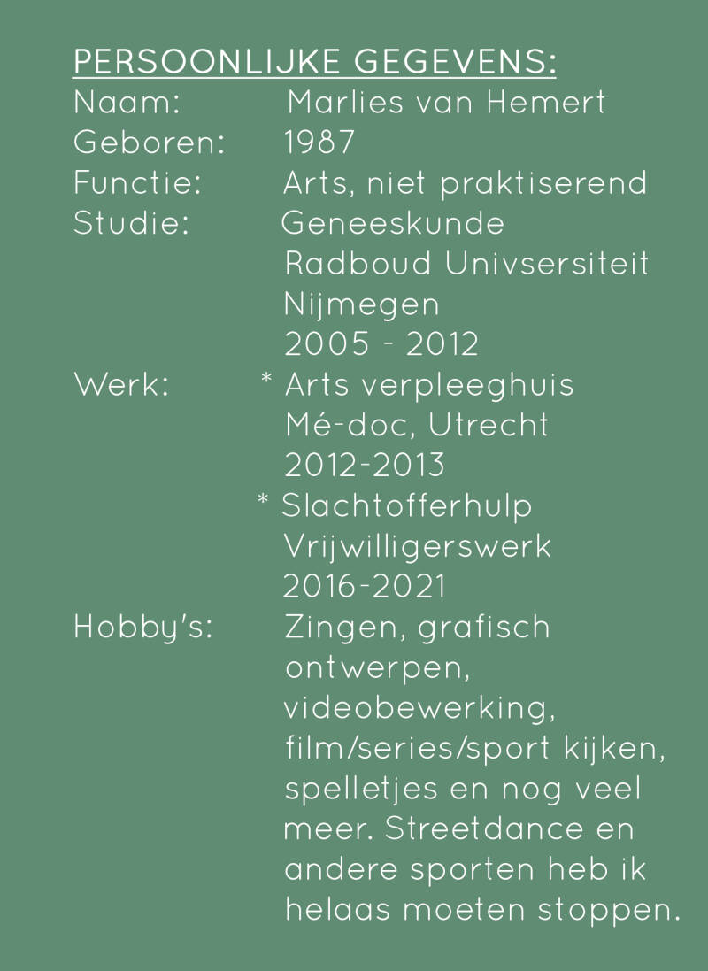 Ik ben Marlies van Hemert en ik woon in Noord-Brabant. Rond mijn 15e jaar kreeg ik zonder duidelijke aanleiding last van hevige vermoeidheidsklachten. Ik had moeite met staan en met inspanning en voelde me altijd moe. Met een aangepaste regeling heb ik mijn droom om arts te worden gelukkig kunnen realiseren. Helaas heb ik maar kort kunnen werken, door toename van de klachten werd ik volledig arbeidsongeschikt. Mijn hoofd wilde heel graag, maar m'n lichaam kon daar niet in mee. In al die jaren bleef ik zoeken naar wat mij zo moe maakte. Artsen, therapieën, gespecialiseerde trajecten; ik probeerde van alles om weer beter te worden, maar helaas gebeurde dat niet. Zorgverleners vonden het vaak erg lastig om goed om te gaan met mijn onverklaarde klachten en door onjuiste aannames en adviezen heb ik mijn klachten jarenlang genegeerd. Dat zorgde er uiteindelijk voor dat mijn lichaam helemaal uitgeput raakte.
